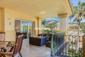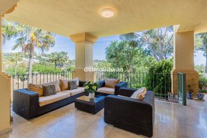 La gran terraza de la planta superior ofrece vistas al campo de golf de Río Real y vistas parciales al mar, con sol de tarde hasta las 16:00 horas.
