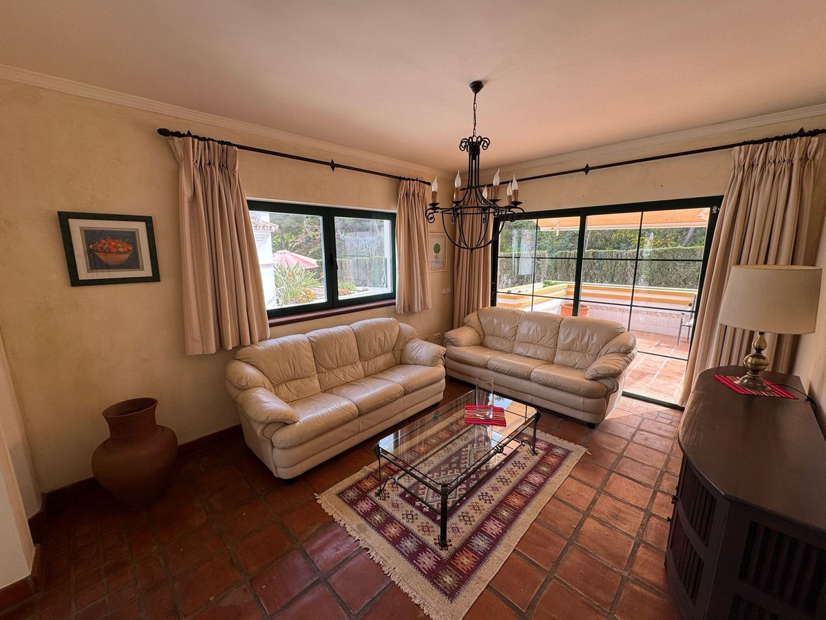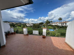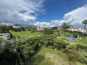 La comunidad ofrece preciosos jardines, dos piscinas comunitarias, una de ellas climatizada, ideales para disfrutar todo el año. En el interior, la vivienda cuenta con un luminoso salón-comedor de concepto abierto con chimenea y acceso a una amplia terraza con vistas panorámicas a la montaña, al campo de golf y a la piscina.