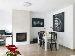 En la planta principal, se encuentra un acogedor salón que destaca por su chimenea, ideal para crear un ambiente cálido en los meses más frescos y el comedor integrado. La cocina, completamente equipada y funcional. Esta planta cuenta tambien con un aseo de invitados. Desde el salón, se accede a una terraza muy privada y acogedora, perfecta para disfrutar de momentos al aire libre.