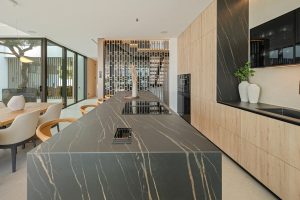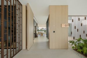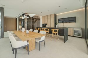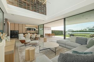 La entrada se abre a un espacio de estar de doble altura dispuesto alrededor de un impresionante patio interior donde un olivo maduro se eleva por el centro de la vivienda. Alrededor de este punto focal arquitectónico, la planta principal fluye a través de una cocina abierta, comedor y salón enmarcados por ventanales de suelo a techo. El mobiliario de roble, los suelos de piedra clara y la iluminación sutil crean una atmósfera residencial y serena, mientras que las terrazas extienden naturalmente las áreas de estar al exterior.