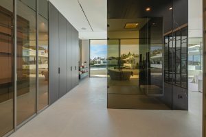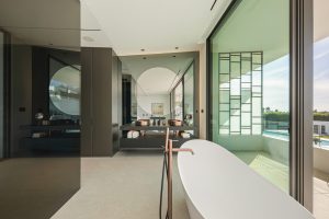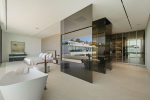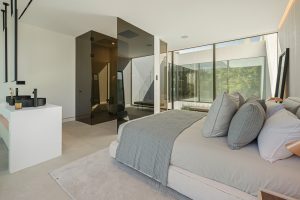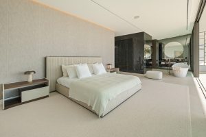 El nivel superior está dedicado a las suites de dormitorio. La suite principal se extiende a lo largo de la fachada con acristalamiento orientado al mar, acceso a una terraza privada y un baño escultórico con bañera exenta y vestidor integrado. Dos suites adicionales para invitados siguen el mismo lenguaje de diseño sobrio de piedra clara, líneas limpias y ventanales orientados al jardín.