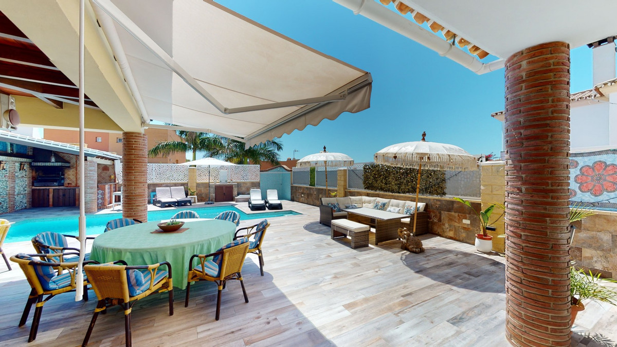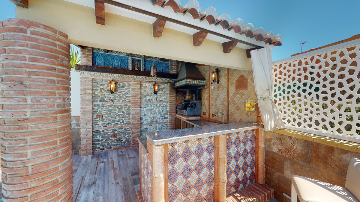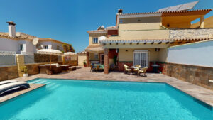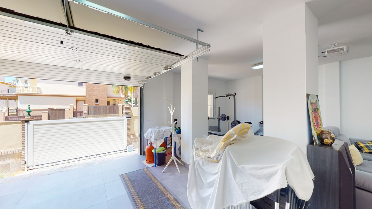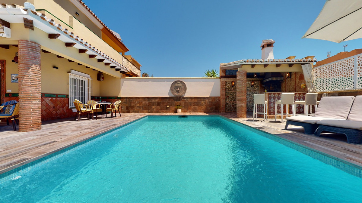 Casa Pareada hermosamente renovada en la tranquila zona residencial de Viña Málaga. La propiedad cuenta con 2 acceso a una vivienda de 3 plantas con 3 habitaciones, 3 cuartos de baño, un aseo 2 cocinas, un salón, una zona de cine, 3 zonas de relax en el exterior, una piscina y una zona de barbacoa. En la planta baja hay un garaje doble que ahora se está utilizando como cine, también cuenta con una zona de gimnasio, una cocina y un aseo. Esta parte se puede utilizar para organizar quedadas con amigos, un apartamento independiente con 2 habitaciones… también tenemos acceso directo desde el garaje al primer piso. El primer piso tiene un hall de entrada con guardarropa, baño con ducha, cocina amueblada con todos los electrodomésticos modernos y salida al balcón, sala y comedor con chimenea y desde el salón hay una salida a la hermosa zona exterior. Allí encontrará el gran patio con muchas áreas para sentarse y descansar alrededor de la piscina de 4 x 8 m, ducha al aire libre y hermosos adornos. También hay un bar rústico y una zona de barbacoa con agua y electricidad. Por la noche, todo tiene una iluminación romántica y es maravilloso cenar al aire libre con la familia y los amigos. En el segundo piso se encuentran los tres dormitorios, uno de los cuales tiene vestidor y baño privado. Cada habitación tiene su balcón con vistas al mar. La propiedad ha sido construida en el 2002 y recientemente renovado. No pierdas la oportunidad de visitar este maravilloso pareado a 5 minutos de la playa, autovía y golf. Estamos encantados de poder presentar esta propiedad a usted pronto, ya sea personalmente o a través de la visión virtual. Porque este mundo, es único – como nuestra Axarquía. En Andalucía. En la Costa del Sol. Aquí, en el lado soleado de la vida…