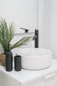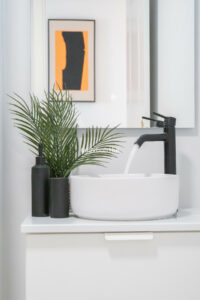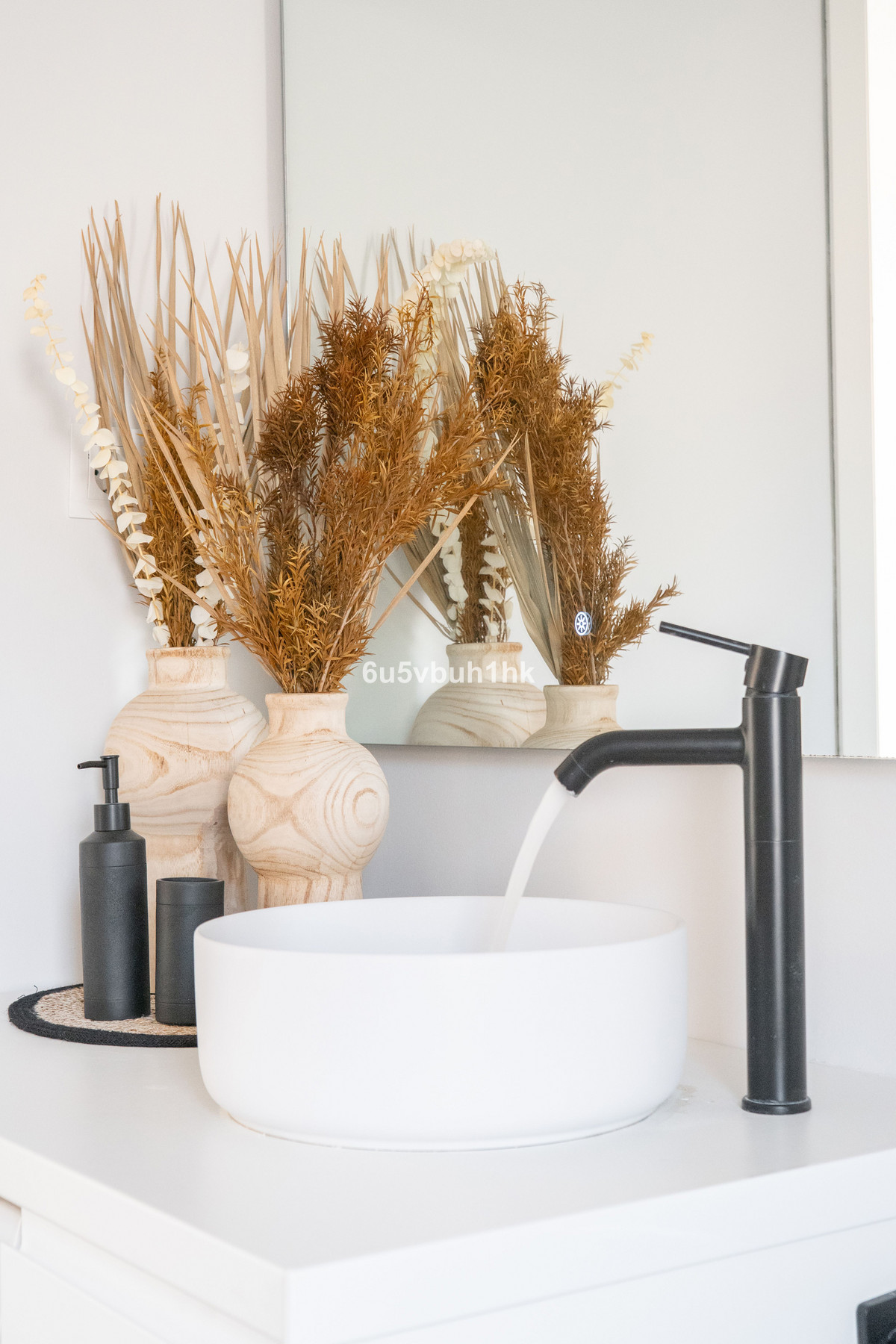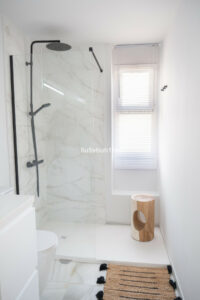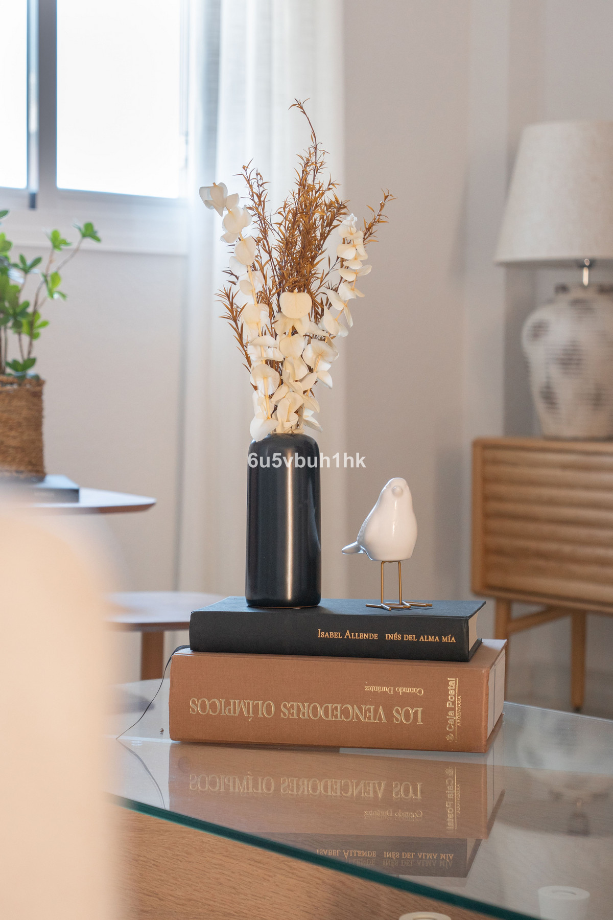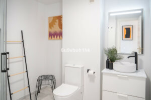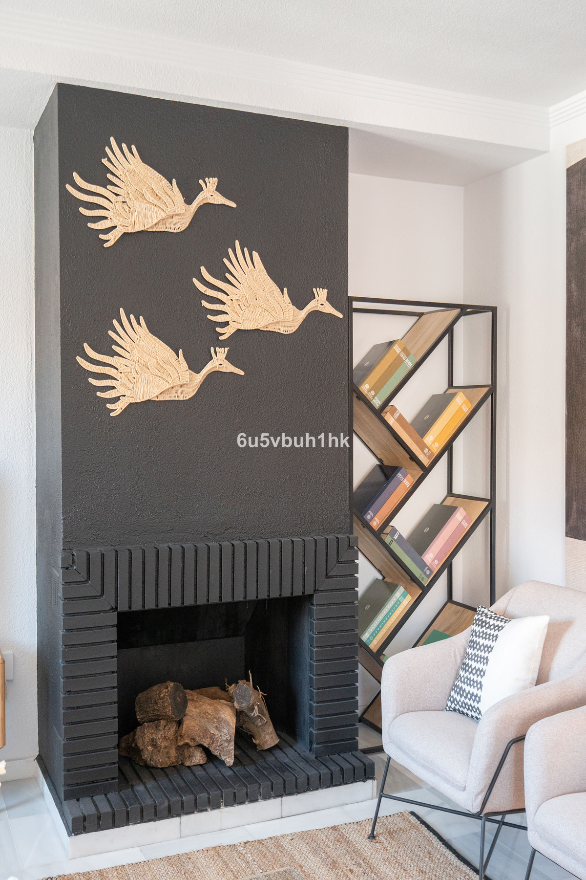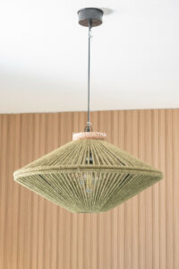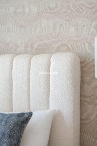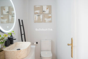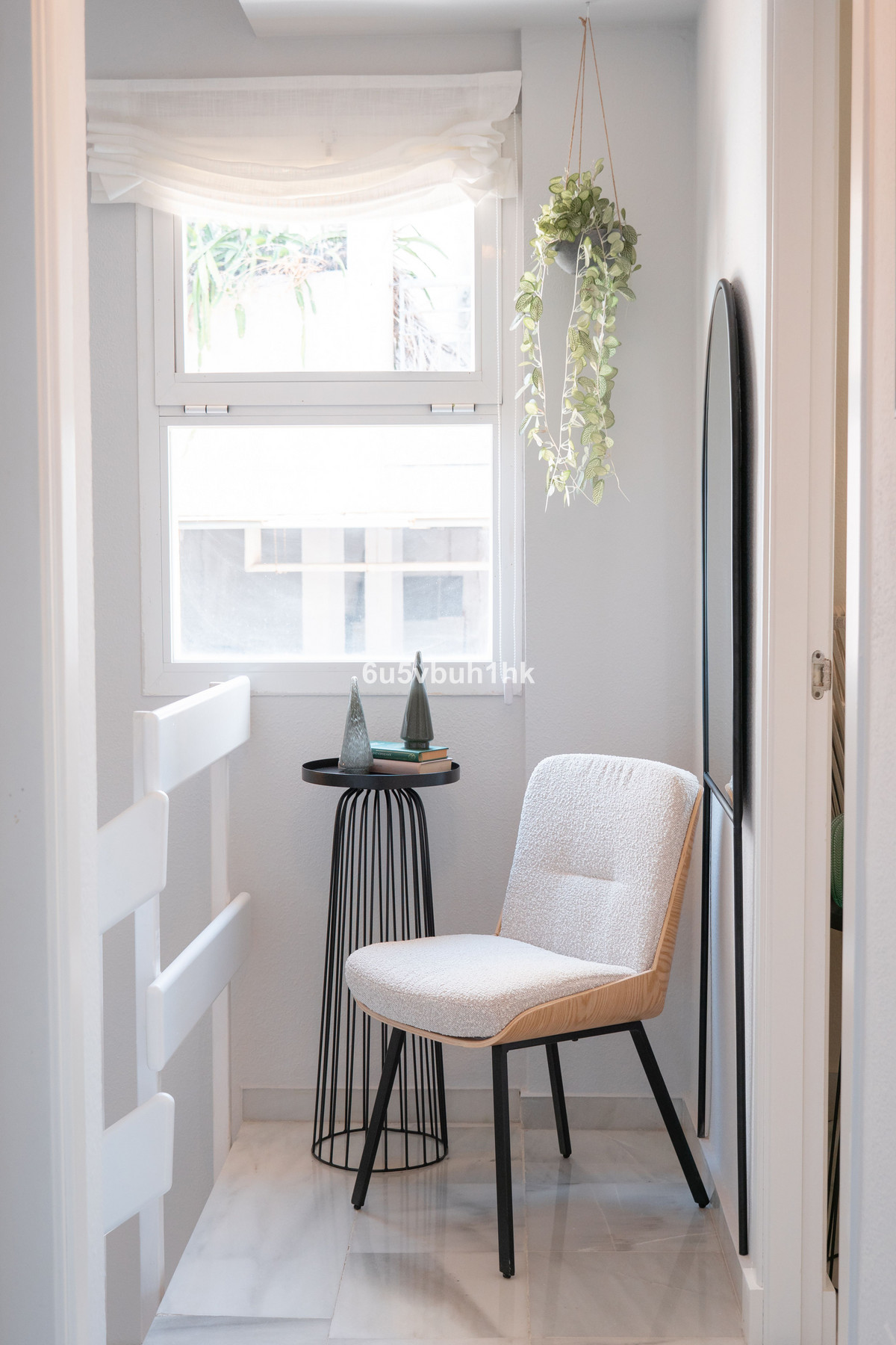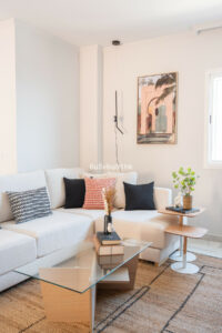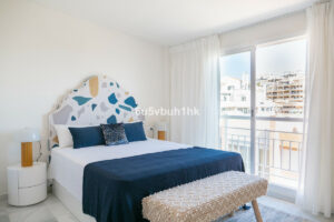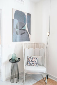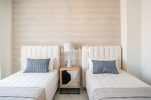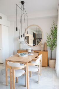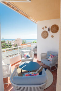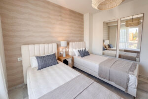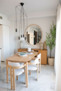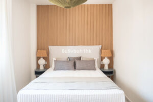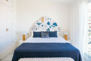 Arriba encontramos tres dormitorios amplios y dos baños. El principal tiene baño en suite, orientación este, bañado por el sol de la mañana, y vistas al mar. Todos los dormitorios están amueblados y decorados con un gusto impecable: mesas de estudio, lámparas de diseño, cojines hechos a mano y tejidos en tonos neutros que transmiten calma.