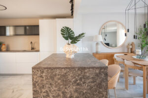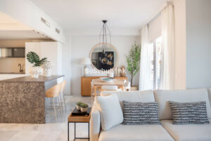En la planta principal, un amplio salón con chimenea y una decoración cálida dan la bienvenida. La zona de comedor se abre a una gran terraza con vistas al mar, amueblada con elegancia, ideal para disfrutar del atardecer o simplemente relajarse mientras los niños se bañan en la piscina comunitaria. La cocina, con isla central, es moderna, funcional y preciosa. Todo el espacio fluye con naturalidad, invitando a compartir momentos en familia.