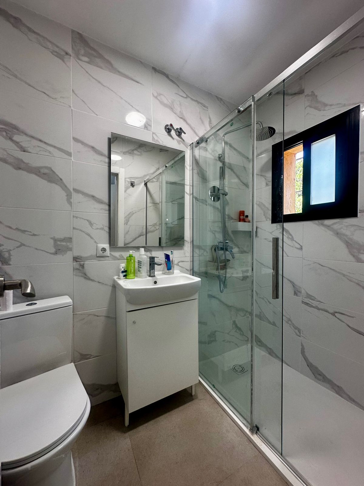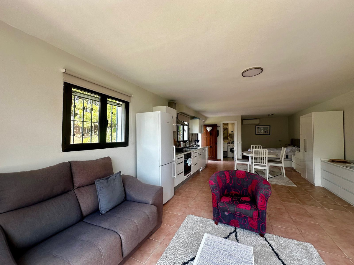 La vivienda principal se distribuye en dos plantas y cuenta con dos amplios dormitorios y dos baños completos. Ambos dormitorios disponen de terraza privada, una de ellas con preciosa vista al mar, ideal para disfrutar de la calma y la luz de la Costa del Sol.