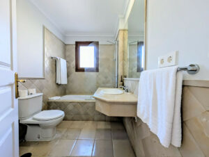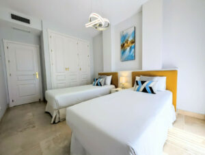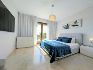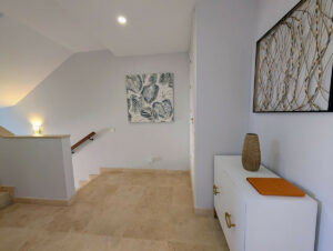 Subiendo las escaleras se encuentra un distribuidor que conduce al amplio dormitorio principal con baño en suite y a otros dos amplios dormitorios de invitados que comparten baño familiar. Todos los dormitorios tienen acceso a terrazas, armarios empotrados y termostatos independientes para el aire acondicionado. La última planta consta de un dormitorio adicional o un estudio/oficina con baño privado y acceso a una magnífica terraza en la azotea, perfecta para reuniones al aire libre con familiares y amigos. La terraza disfruta de sol todo el día, impresionantes vistas panorámicas al mar Mediterráneo y está equipada con barbacoa, cocina de verano, vinoteca, una cómoda sala de estar y un solárium.