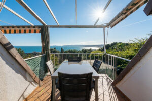 La casa se distribuye en varias plantas. En la planta principal encontramos una cocina totalmente equipada, aseo de invitados y un amplio salón-comedor muy luminoso con acceso directo a una agradable terraza con vistas abiertas al mar, perfecta para desayunos al sol o cenas al atardecer.