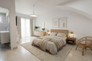 En la planta superior se ubica un espacioso dormitorio tipo ático con aseo privado y vistas excepcionales. En la planta baja se sitúa el dormitorio principal con baño en suite, dos dormitorios adicionales y otro baño completo, con salida directa al exterior privado formado por un acogedor porche de 27 m² y un jardín de 33 m², un espacio ideal para disfrutar del clima de la Costa del Sol durante todo el año.