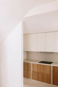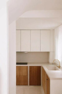 Cocina de diseño en madera de roble, hecha a medida y equipada con electrodomésticos de alta gama (Haier, Siemens y Bosch). Encimera Dekton y grifería de estilo icónico que se mantiene en toda la vivienda.