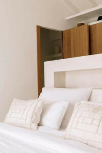 Dormitorio principal con vistas abiertas a La Concha. Base de cama de microcemento y cama doble de 200×200 cm con tomas eléctricas integradas. Persianas eléctricas y ventanas con doble acristalamiento. Armarios empotrados de roble.