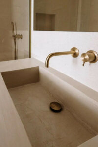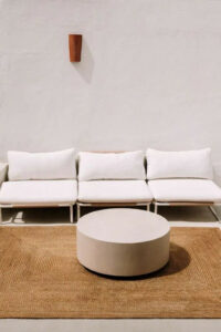 Patio de entrada con acabado en microcemento, zona de estar soleada todo el día, jardineras y ducha exterior con agua caliente y fría.