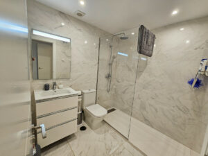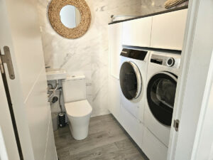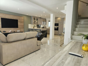 Se accede a la vivienda a través de una amplia terraza privada y segura, orientada al oeste para aprovechar al máximo el sol. Al entrar, encontramos un gran espacio diáfano con una cocina de alta gama equipada con encimeras de Silestone y electrodomésticos modernos, zona de comedor y salón. Junto a la cocina hay también una barra de desayuno en la parte trasera y un lavadero independiente con aseo y acceso a un patio posterior que ofrece espacio adicional de almacenaje. En la planta superior se encuentran los 4 dormitorios: el principal con baño en suite y los otros tres comparten un baño. Todos los dormitorios disponen de aire acondicionado y tienen un buen tamaño.