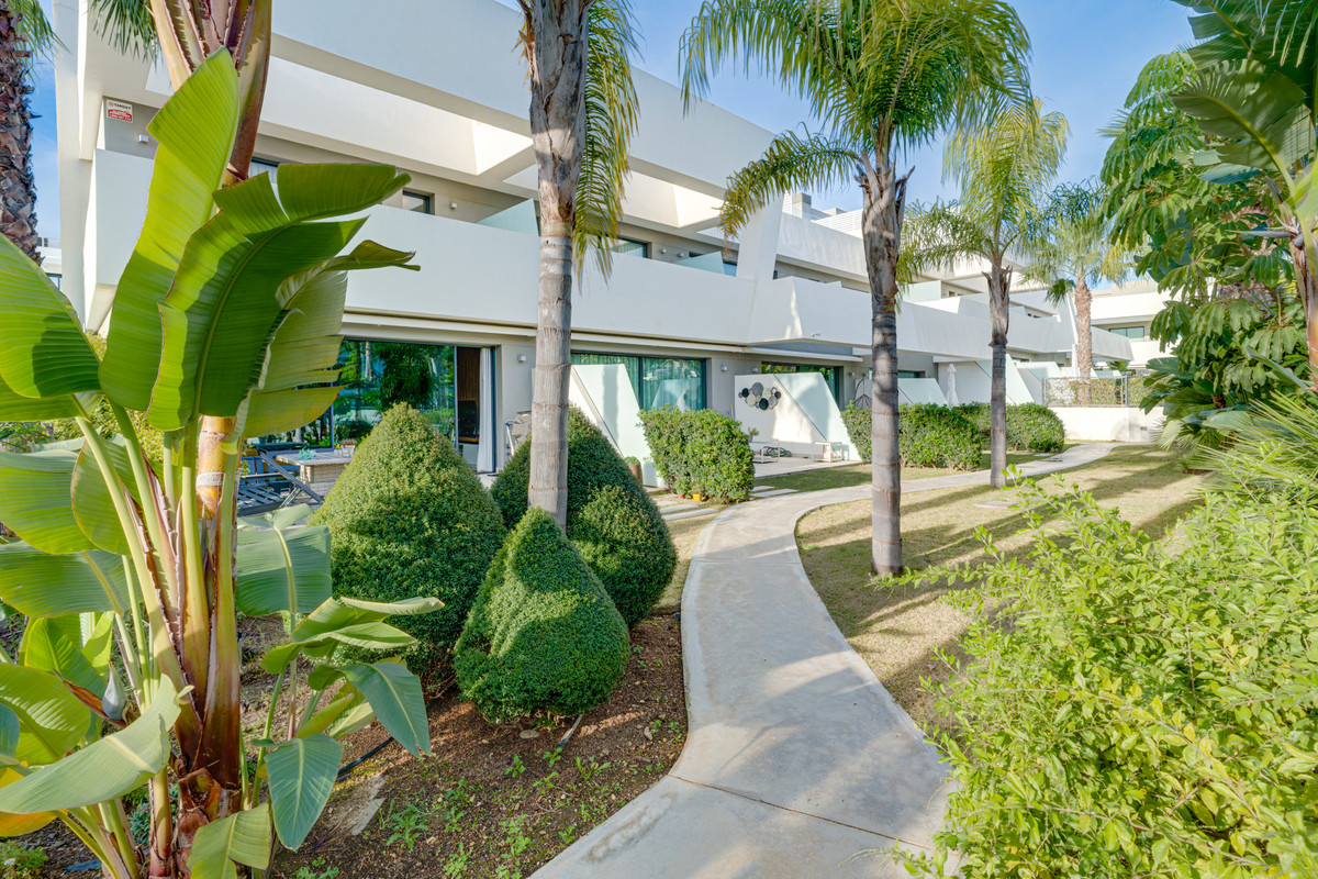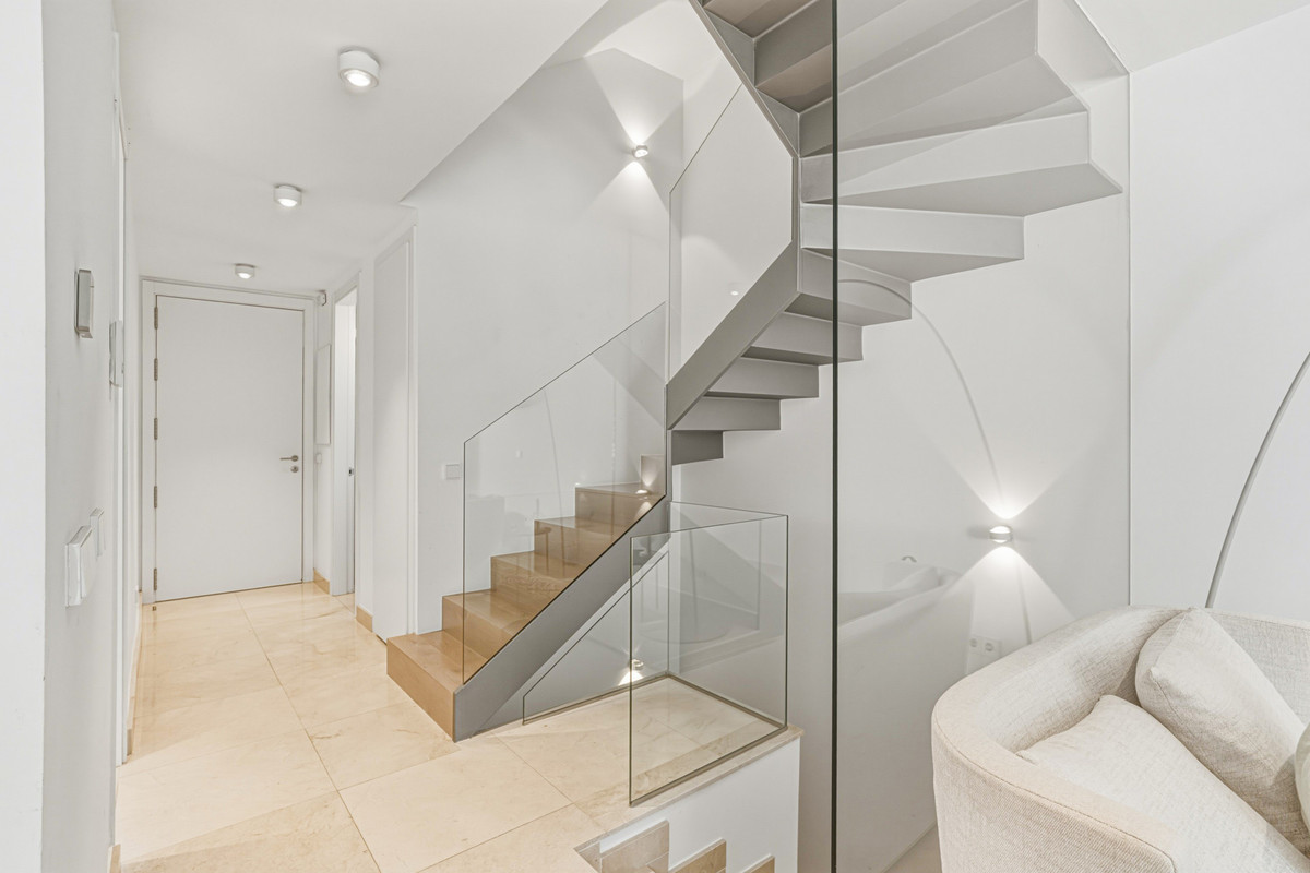 La planta baja cuenta con una luminosa sala de estar y comedor de planta abierta con una cocina moderna totalmente equipada, que se abre a un jardín privado con acceso directo a la piscina comunitaria, creando un estilo de vida interior ideal. Este nivel también incluye un dormitorio de invitados y un baño completo. En la primera planta, la propiedad ofrece una amplia suite principal con terraza privada, dos dormitorios adicionales y un elegante baño compartido. El nivel superior conduce a un generoso solárium privado, completo con una zona de barbacoa y piscina sumergible, perfecto para relajarse o entretenerse. El nivel inferior ofrece una gran sala multiusos, ideal para un gimnasio o sala de juegos, junto con un lavadero, área de almacenamiento y acceso interno directo al garaje. Otras características incluyen aire acondicionado frío y caliente, dos plazas de aparcamiento privado y servicio de conserjería. Esta propiedad ofrece una combinación perfecta de diseño contemporáneo, comodidad y una ubicación privilegiada.