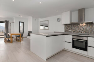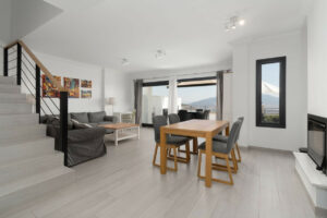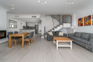La vivienda está distribuida en varias plantas, comenzando desde el acceso privado en la planta superior. Dispone de cuatro dormitorios y tres baños completos, uno de ellos con bañera y bidet. La zona principal de estar cuenta con un diseño de planta abierta, con un salón-comedor de 35 m², una chimenea moderna y una cocina totalmente equipada con una gran isla central. Desde aquí se accede a una terraza amplia de más de 30 m², ideal para disfrutar de las vistas y de la tranquilidad del entorno.