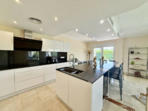 El corazón de la casa es una impresionante cocina Nolte, recientemente reformada y equipada con electrodomésticos integrados de alta calidad y una nevera para vinos, ideal para los chefs caseros y las reuniones familiares alrededor de la espaciosa barra de desayuno. La amplia sala de estar está inundada de luz natural gracias a las múltiples puertas acristaladas que dan a una terraza cubierta y a un gran jardín comunitario con vistas abiertas al valle del golf.