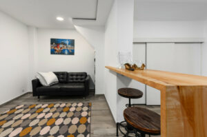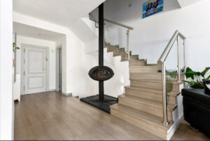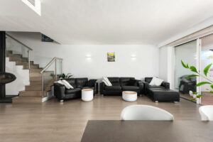 Un acogedor recibidor da la bienvenida y conduce a un luminoso aseo de invitados. La moderna cocina de concepto abierto está totalmente equipada con electrodomésticos de alta gama, diseñada para ofrecer funcionalidad y estilo. El amplio salón-comedor, con chimenea de leña, crea un ambiente cálido y elegante. Grandes ventanales correderos dan acceso a una espaciosa terraza, perfecta para cenas al aire libre con vistas despejadas al golf y a la montaña.