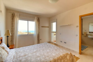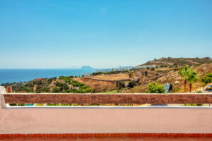 Un tercer dormitorio con baño en suite (también con luz natural) que se abre a una amplia terraza con espectaculares vistas panorámicas al mar, hacia Gibraltar y la costa africana.