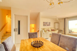 Amplio salón-comedor, gran cocina totalmente equipada, aseo de invitados y dos terrazas. Una terraza orientada al este, ideal para disfrutar del sol de la mañana, y otra, accesible desde el salón-comedor, con preciosas vistas al mar y acceso directo al jardín privado.