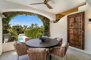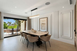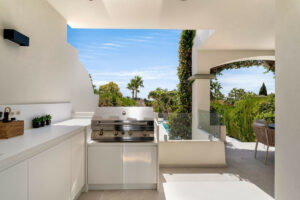 La planta baja se abre a la terraza del jardín, que cuenta con un comedor adicional y una cocina exterior (una cocina de Corian blanco mate totalmente sólida y hecha a medida, con barbacoa, fregadero y nevera), complementada con una mesa de comedor para ocho personas, el espacio exterior ideal para el entretenimiento. Al salir al jardín, le espera una piscina climatizada de agua salada con asientos adicionales y tumbonas.