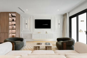 Se completa con un fantástico sótano con acceso independiente desde la parte delantera de la casa. Cuenta con su propia cocina, baño, vestidor y pared multimedia hecha a medida con chimenea. El acceso independiente adicional a la piscina desde el sótano es una característica única que solo tiene Vasari 25 en comparación con las casas de los alrededores, una característica que llena el sótano de luz natural. En este nivel también se encuentra un lavadero adicional, fuera de la vista de las zonas de estar, junto con un garaje cerrado y una plaza de aparcamiento.