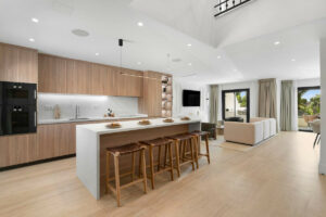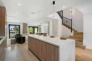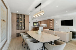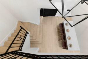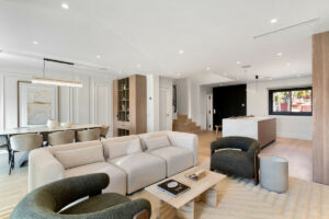 Consta de tres niveles. La planta baja, con una distribución diáfana entre la cocina, el comedor y la sala de estar, ofrece un espacio sociable y fácil de usar. Una cocina de alta calidad y bellamente diseñada, con encimeras de porcelana a juego, electrodomésticos Gaggenau y calefacción por suelo radiante. Un comedor formal con capacidad para 8 personas y una acogedora sala de estar, complementada con muebles hechos a medida y exclusivos para este proyecto, completan esta planta.