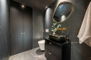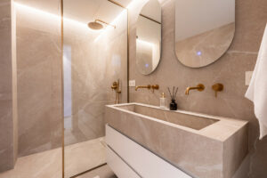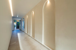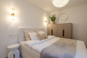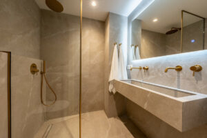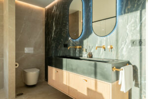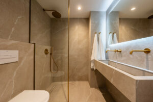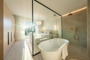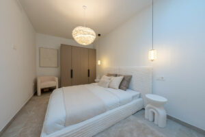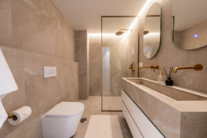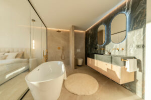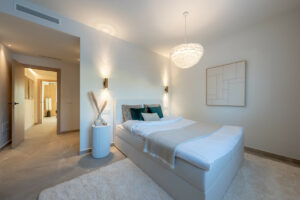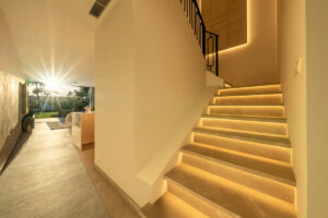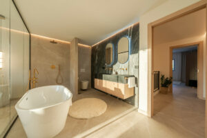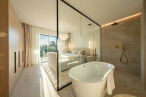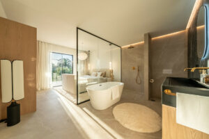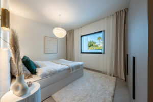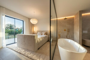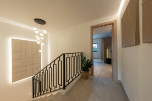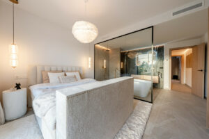 En la planta superior, la suite principal y los dormitorios de invitados ofrecen un ambiente sereno y elegante, con materiales de alta calidad y tonos suaves y neutros.