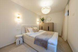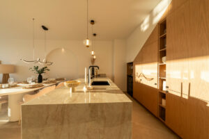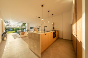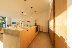 Diseñada con una estética mediterránea moderna, la vivienda combina elegancia, luz natural y calidez. La zona de estar de planta abierta cuenta con una cocina a medida con acabados en madera natural y mármol, que se integra perfectamente con el comedor y el salón. Las amplias puertas de cristal se abren a una terraza privada y a un jardín paisajístico — un espacio ideal para disfrutar del estilo de vida al aire libre.