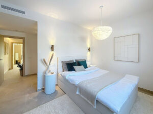 En la planta superior, el dormitorio principal disfruta de una terraza privada con vistas a los jardines, la piscina y las montañas de Golf Valley. Un dormitorio adicional con baño en suite completa este nivel, asegurando privacidad y comodidad para todos.