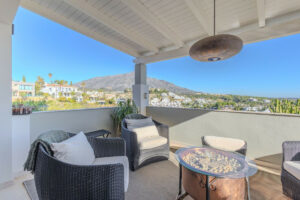 Ubicada en la prestigiosa y segura urbanización cerrada de Aldea Dorada, esta vivienda pareada ofrece la comodidad de una casa adosada con la presencia elevada de un ático, situada en una de las zonas más exclusivas y tranquilas de Nueva Andalucía. Desde su posición privilegiada, la propiedad disfruta de excepcionales vistas panorámicas al mar Mediterráneo, al Valle del Golf y a la emblemática montaña de La Concha, ampliamente consideradas entre las mejores vistas de Nueva Andalucía y el elemento más distintivo de la vivienda.