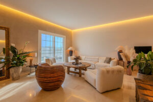 Tras una clásica fachada andaluza, el interior revela una cálida y refinada renovación de estilo Japandi, con techos altos, espacios diáfanos y baños modernos que crean una atmósfera serena y elegante. La planta de entrada ofrece un salón-comedor de concepto abierto con una llamativa chimenea suspendida, una discreta zona de despacho y acceso directo a una terraza parcialmente cubierta diseñada para disfrutar plenamente de las vistas.