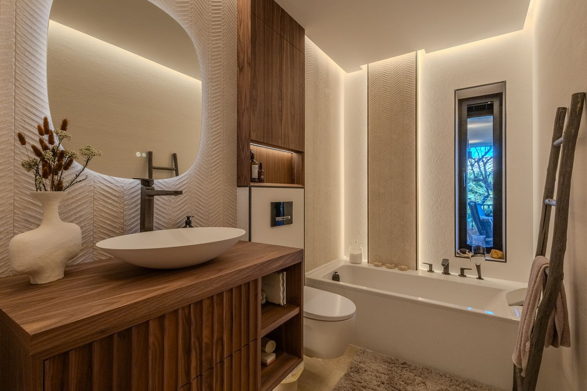 Tras una clásica fachada andaluza, el interior revela una cálida y refinada renovación de estilo Japandi, con techos altos, espacios diáfanos y baños modernos que crean una atmósfera serena y elegante. La planta de entrada ofrece un salón-comedor de concepto abierto con una llamativa chimenea suspendida, una discreta zona de despacho y acceso directo a una terraza parcialmente cubierta diseñada para disfrutar plenamente de las vistas.