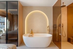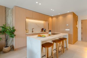 La sala de estar y comedor de planta abierta se conecta perfectamente con la cocina de diseño totalmente equipada, creando un espacio luminoso y funcional ideal para entretener. Las puertas de vidrio de suelo a techo inundan los interiores con luz natural y proporcionan acceso directo a la terraza privada y al jardín. Pisos de piedra de alta calidad y acabados premium realzan la estética contemporánea, mientras que el aire acondicionado central con tecnología Airzone permite el control individual del clima en cada habitación. La calefacción por suelo radiante en los baños garantiza un confort durante todo el año.