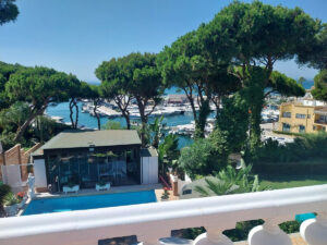 Exclusiva casa pareada con piscina privada frente al Puerto de Cabopino y vistas panorámicas al mar.
