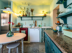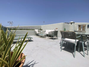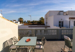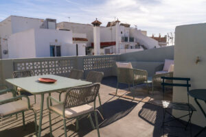 El apartamento cuenta con tres dormitorios y dos baños con ducha. La cocina, totalmente equipada y llena de encanto, es ideal para cocinar a diario. El acogedor salón tiene una escalera que conduce al solárium privado, un entorno idílico para tomar el sol, relajarse o disfrutar de comidas al aire libre.
