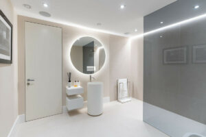 Baños con cerámica de tonos suaves, lavabos Boffi