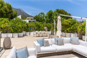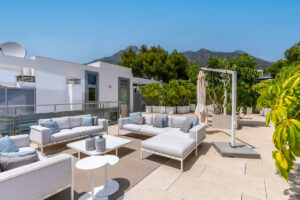 En la parte superior hay un solárium de 150 m². Espectacular panorama de más de 180º al mar, la costa africana, el famoso puerto de Puerto Banús y la montaña de La Concha. Las puestas de sol desde este lugar son mágicas.