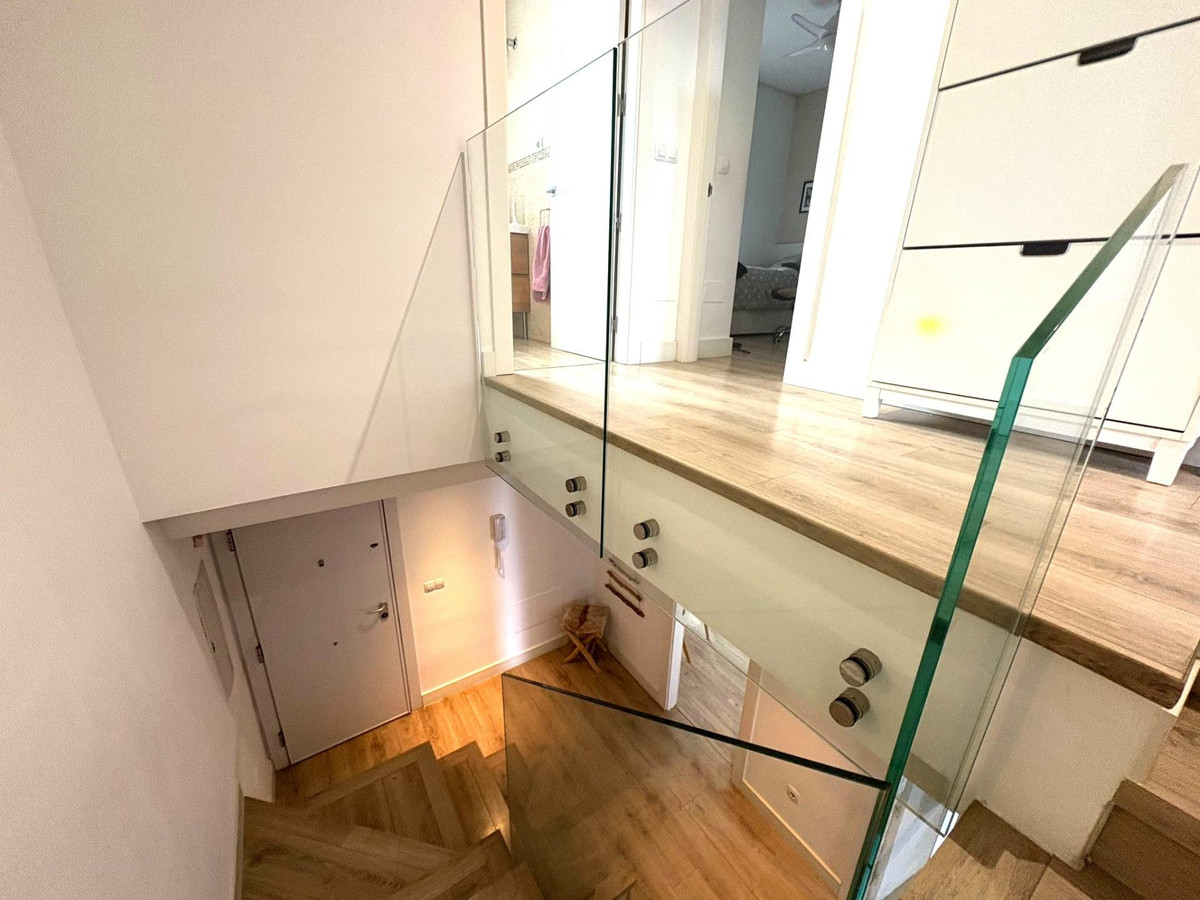 Al ingresar, nos recibe un amplio y luminoso recibidor presidido por una elegante escalera de diseño moderno, con barandilla de cristal templado, que aporta un toque contemporáneo a la vivienda. La planta principal ofrece una distribución funcional con una cocina totalmente equipada, lavadero independiente, un baño completo, un dormitorio y un espacioso salón-comedor con salida directa a una generosa terraza. Desde aquí se pueden contemplar unas impresionantes vistas despejadas a la bahía de Málaga, un verdadero lujo diario.
