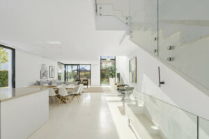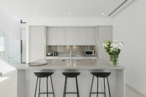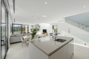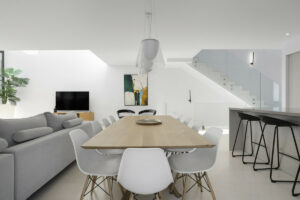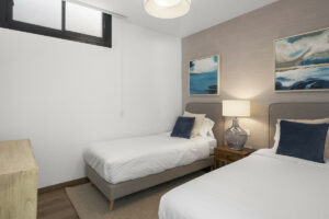 La cocina contemporánea de la planta baja permite experiencias de cocina sociables, con fácil interacción entre los espacios vivos de planta abierta. El nivel inferior cuenta con dos dormitorios que comparten un baño, diseñado inteligentemente para beneficiarse de una amplia luz natural y aire fresco. Este nivel también incluye un salón de televisión dedicado, perfecto para noches tranquilas o entretenimiento familiar.