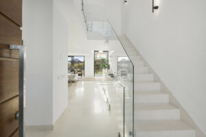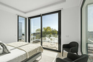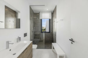 En la planta superior, la suite principal disfruta de su propio baño y terraza privada con impresionantes vistas al jardín, piscina, campo de golf y costa. Dos dormitorios más comparten un baño adicional en este nivel.