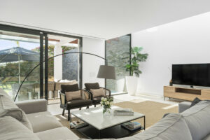 Dentro, la villa impresiona inmediatamente con su diseño de planta abierta. La planta principal fluye sin esfuerzo desde la cocina hasta las amplias zonas de estar y comedor, extendiéndose a una terraza bien amueblada, jardín ajardinado, y piscina acogedora. Una piscina adicional en la terraza ofrece otro lugar para relajarse y disfrutar del sol.