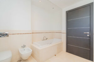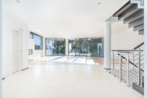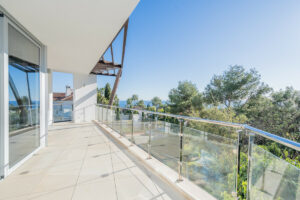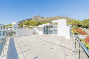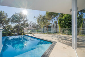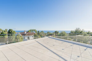 La villa dispone de 5 dormitorios, cada uno con su propio baño, un amplio garaje, trastero, ascensor privado y un magnífico solárium en la azotea con vistas panorámicas. Además, cuenta con piscina privada en la planta baja.