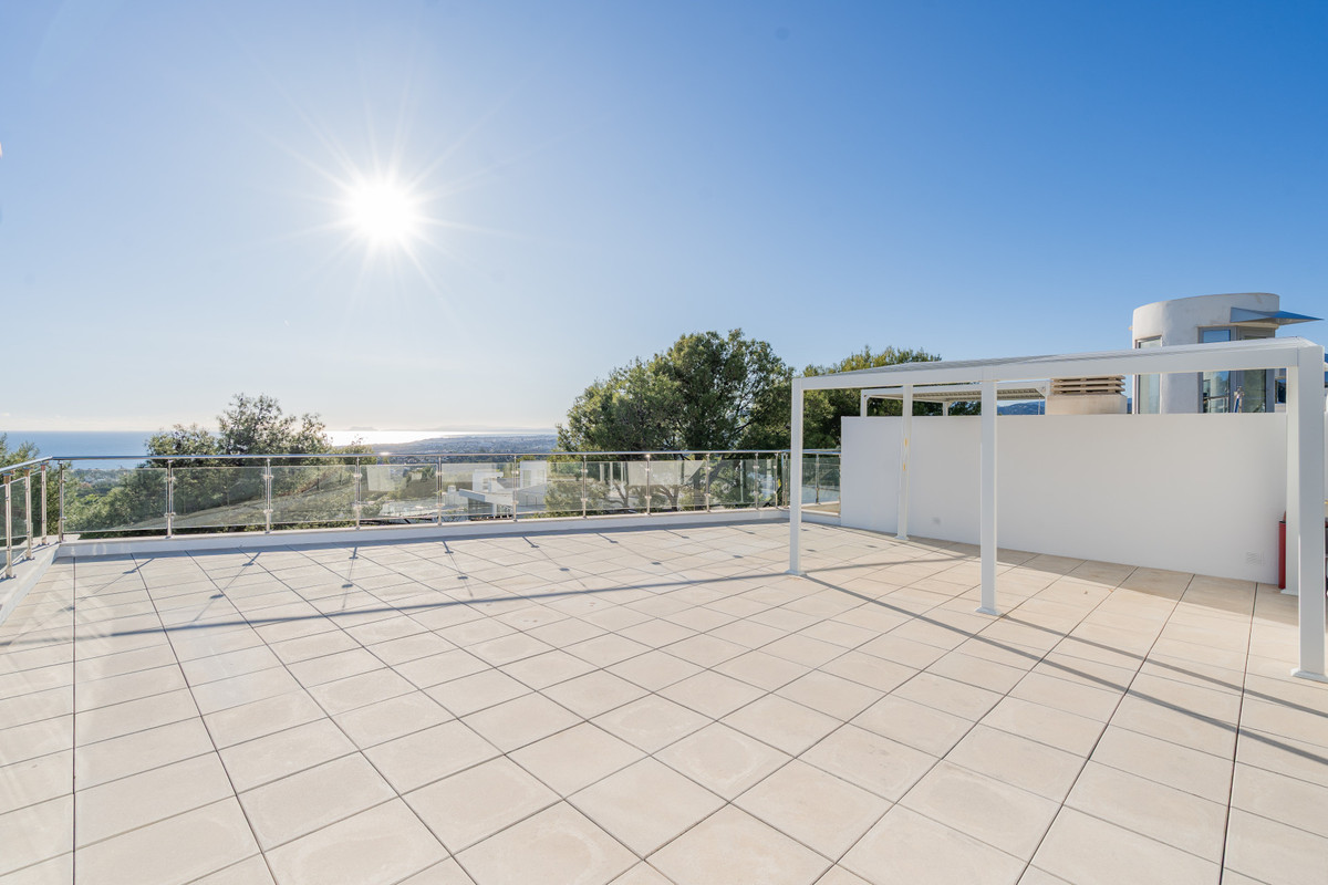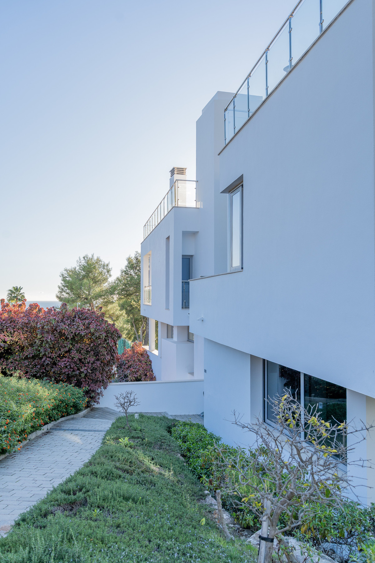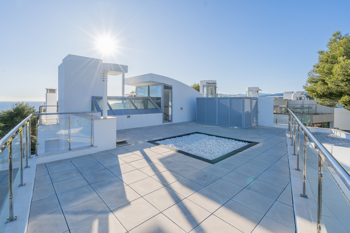 La villa dispone de 5 dormitorios, cada uno con su propio baño, un amplio garaje, trastero, ascensor privado y un magnífico solárium en la azotea con vistas panorámicas. Además, cuenta con piscina privada en la planta baja.