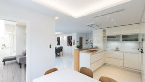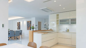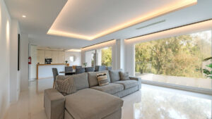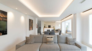 La vivienda cuenta con dos salones, uno en la planta principal y otro junto a la piscina, ofreciendo múltiples opciones de uso y facilitando la vida familiar o el entretenimiento. La cocina, totalmente equipada, incluye un área para comer que se integra de manera fluida con el salón principal.