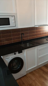Una cocina moderna con electrodomésticos integrados y acabados de diseño.