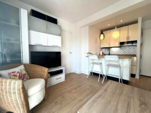Desde el primer momento, la vivienda transmite una agradable sensación de amplitud y bienestar. El salón, luminoso y acogedor, se abre directamente a la terraza, permitiendo disfrutar de vistas abiertas al mar y de la brisa marina durante todo el día. El dormitorio, con armario empotrado, disfruta igualmente de una excelente entrada de luz natural gracias a su privilegiada orientación y a la condición de esquina del apartamento, que garantiza ventilación cruzada y claridad en todas las estancias.