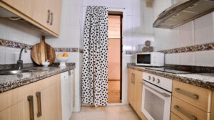 La vivienda cuenta con una cocina independiente, un salón y un dormitorio con armarios empotrados que ofrecen un amplio espacio de almacenamiento. Desde el salón se accede a una de las dos terrazas del apartamento, con espacio para una mesa y sillas, ideal para comidas al aire libre o momentos de descanso.