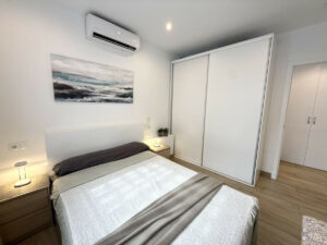 El dormitorio y el moderno baño se encuentran más adentro del apartamento. Los grandes ventanales permiten que entre abundante luz natural en todas las estancias, y el aire acondicionado instalado garantiza un ambiente interior agradable durante todo el año.