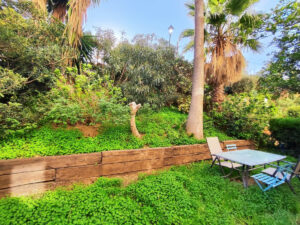 El piso cuenta con una amplia terraza acristalada que se abre a un extenso jardín privado, lleno de césped, árboles y plantas, ideal para disfrutar de momentos al aire libre. La cocina americana está equipada con lavadora y se integra perfectamente con el amplio salón comedor, creando un espacio acogedor y funcional. El dormitorio dispone de armarios empotrados que ofrecen un gran espacio de almacenamiento, y el baño completo está listo para su uso inmediato.
