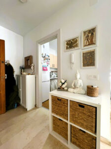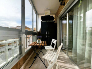 Dispone de un dormitorio amplio con salida directa a la terraza, un baño completo con ducha y un gran salón con cocina abierta. Esta zona principal destaca por su excelente orientación sur, lo que garantiza luz natural durante todo el día. La cocina, diseñada a medida con mobiliario de madera, ofrece un espacio cómodo y práctico para el día a día.