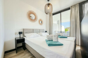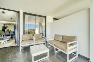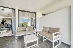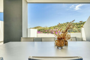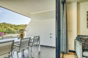 Despiértese con impresionantes vistas al mar y la montaña, salga a su **terraza privada con jardín** y disfrute de la brisa mediterránea durante todo el año. Amueblado con estilo y completamente equipado, este apartamento está **listo para entrar a vivir**, con una **cocina moderna equipada con electrodomésticos Bosch**, diseñada para ofrecer confort y funcionalidad.